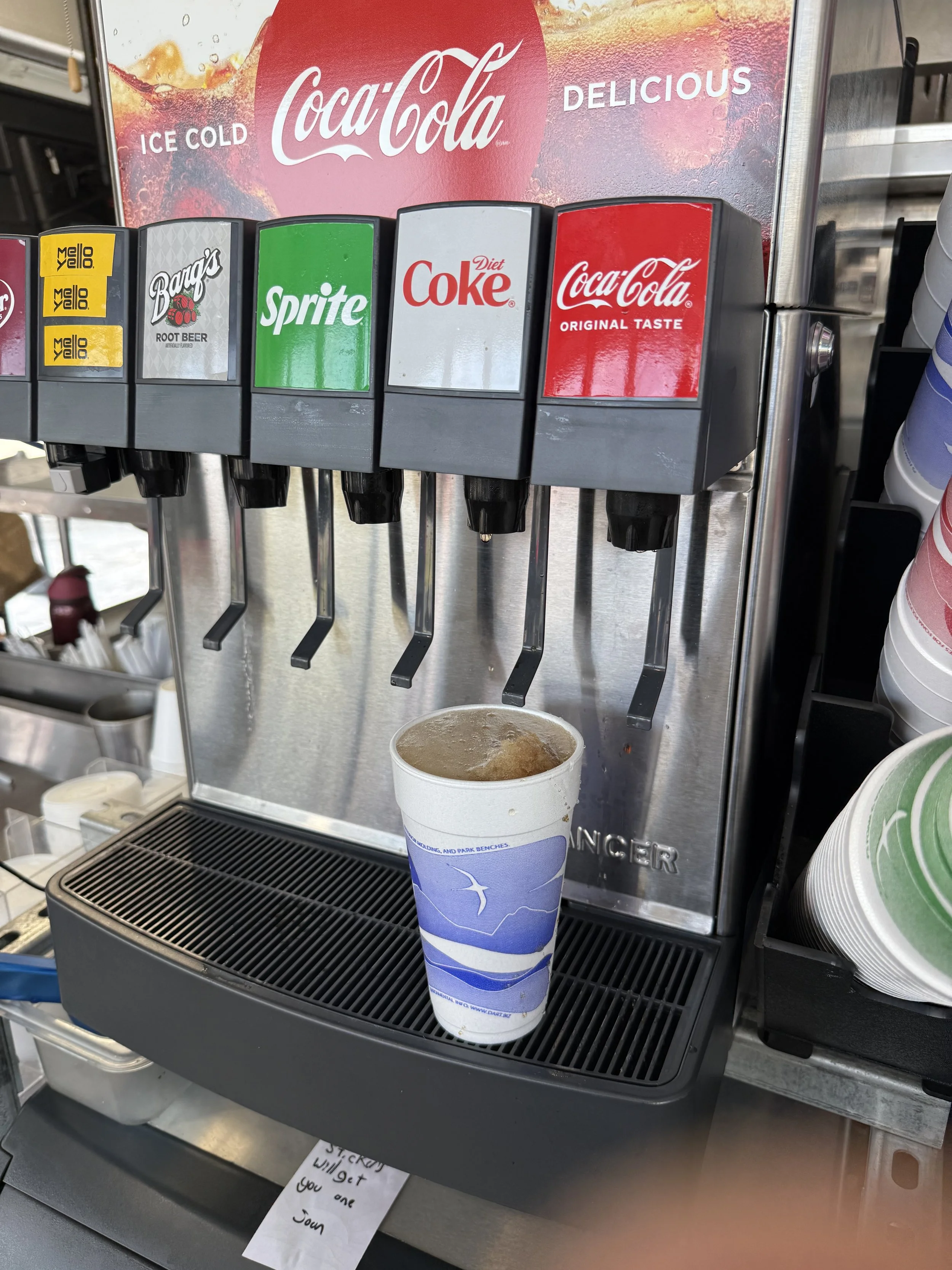 Coke, Diet Coke, Sprite, Dr. Pepper, Root Beer, and Mellow Yellow